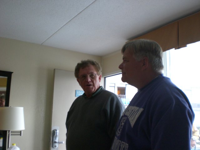 John III chats with Jerry (out of frame to the left), Jim munches, Jeff checks his phone and Eric watches football.