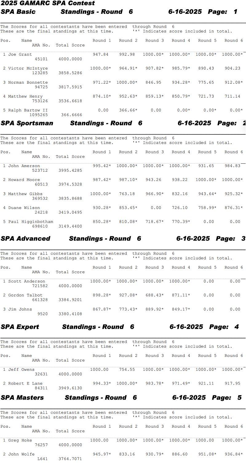 The 4th Annual GAMA SPA Contest, sponsored by the Georgia Aircraft Modelers Assn., was flown on June 14-15, 2025 near Fort Valley, GA. CD Greg Hoke, with help from wife Debbie, granddaughter Ellie and numerous others kept things running smoothly in spite of several rain delays. Kevin Bartoe handled scoring chores on Saturday and Jim Johns did the same on Sunday with assistance from Debbie Hoke on both days. There were a couple of "adventuresome" landings, but no aircraft were damaged during the entire weekend. 17 pilots from 5 states showed up to compete this weekend - 10 from Georgia, 4 from Alabama and 1 each from Florida, Kentucky & Tennessee. The weather didn't cooperate as well as hoped, with cloudy skies and intermittent rain showers & thunderstorms throughout the weekend, but no one's enthusiasm was dampened by it. A light 5-10 mph wind blew most of the time, varying from a direct crosswind to down the runway. More than one pilot took off into the wind, only to have it reverse directions during his flight. However, the light winds kept the temperatures pleasant and the gnats at bay most of the weekend. In short, typical mid-June weather here in the Southeast. CD Greg Hoke called the Pilot's Meeting shortly after 9:00 Saturday morning. He explained the various field rules, procedures and zero lines. He also reiterated that no gas or nitro engine runs were allowed before 10 a.m. on Sunday in deference to the neighbors. John Wolfe then did a short flight to check the ceiling to see if the low hanging "scud" cloud layer was high enough to allow competition to begin. Alas, it was not, so the first round didn't get airborne until 10:00 or so. The 1st round was completed around noon, just in time for the lunch break and a rain delay. The rain continued for about 1 1/2 hours before competition resumed. Four rounds were completed around 6 p.m. Flying resumed at 9:30 Sunday morning with Masters calls flying first because both pilots flew electric powered aircraft. Rounds 5 & 6 were completed by 12:00 because the Advanced class pilots opted out of both Rounds 5 & 6. BASIC class had a fine turn out of 5 pilots - a good sign for the future. Joe Grant won 4 rounds for 1st Place, with Victor McIntyre and Norman Bonnette each winning a round for 2nd & 3rd Places. SPORTSMAN class also featured 5 pilots. John Amerson won 3 rounds with a total score of 3,995 out of a possible 4,000 points. Howard Moore flew won two rounds for a strong 2nd Place finish only 20 points behind John and Matthew Gibbs won 1 round to take home the 3rd Place hardware. ADVANCED class opted to fly only 4 rounds, all of which were won by Scott Anderson. Gordon Talbot captured 2nd Place by only 4 points over Jim Johns in 3rd. SPA President Jeff Owens scored 5 K's to take 1st in EXPERT, closely followed by Robert Lane. Greg Hoke won every round to take the MASTERS class, while John Wolfe flew well for 2nd. The Great Planes Big Stick 60 raffle airplane was won by Howard Moore, and Jeff Owens won the pilots only drawing for $50 in gas money. Many thanks to all who helped make this a great contest in spite of all the weather challenges. As always, the GAMA club put on a great contest, led by CD Greg Hoke, his wife Debbie, their granddaughter Ellie, GAMA Secretary/Treasurer Kevin Bartoe and countless others who jumped in to help when needed. GAMA is always one of my personal favorite stops on the SPA circuit. Jim Johns |