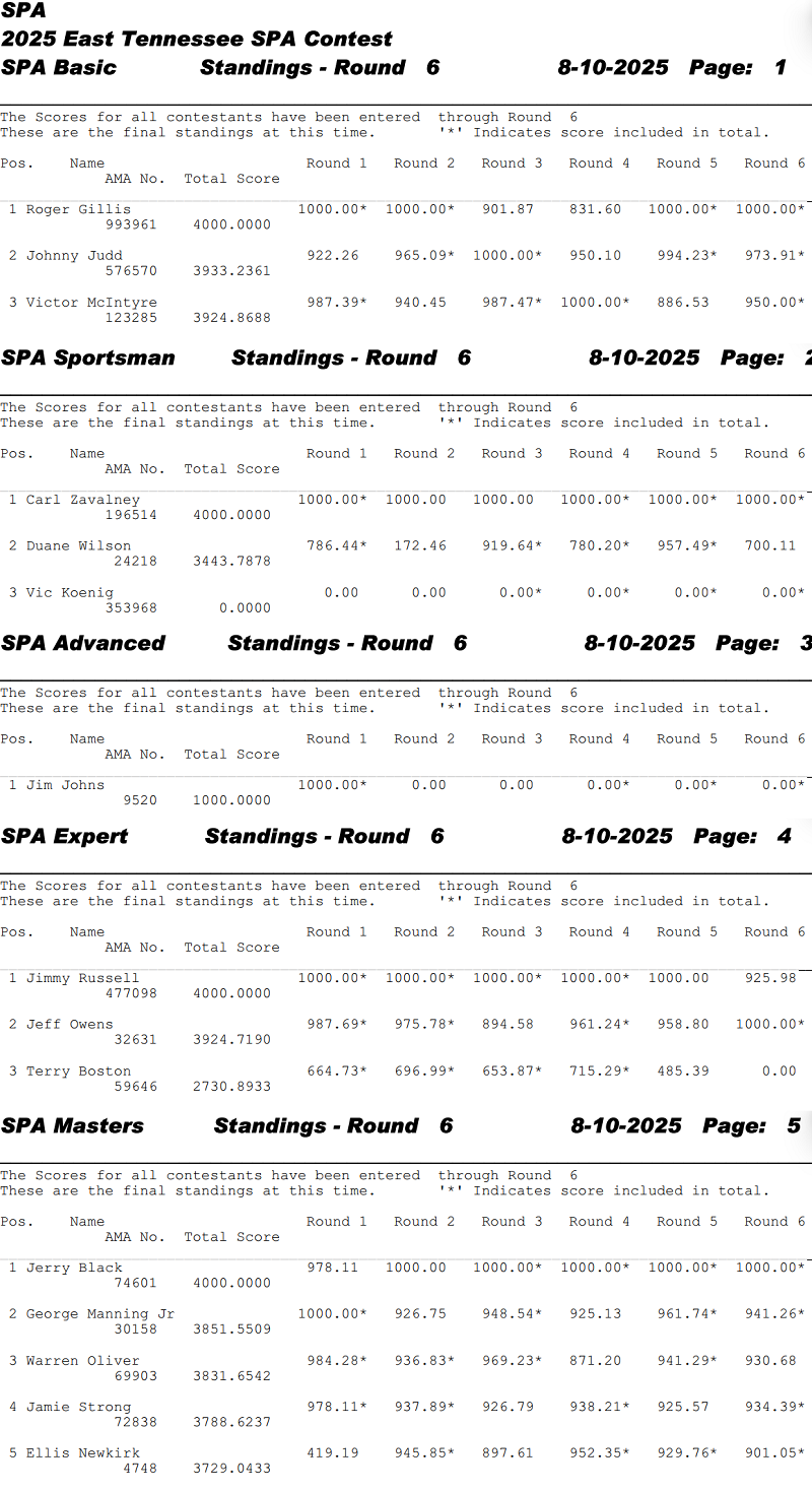 The 6th Annual East Tennessee SPA contest sponsored by the Johnson City Radio Controllers was held August 9-10, 2025 in Johnson City, TN. Although it’s quite a drive for many contestants, it is definitely worth the trip. The JCRC club always gives SPA a warm welcome and a very well-run contest. Also, without doubt, it has one of the best raffles on the circuit, but more about that later. People started arriving Friday for practice. Many practice flights were flown with only one major mishap and a few minor incidents.