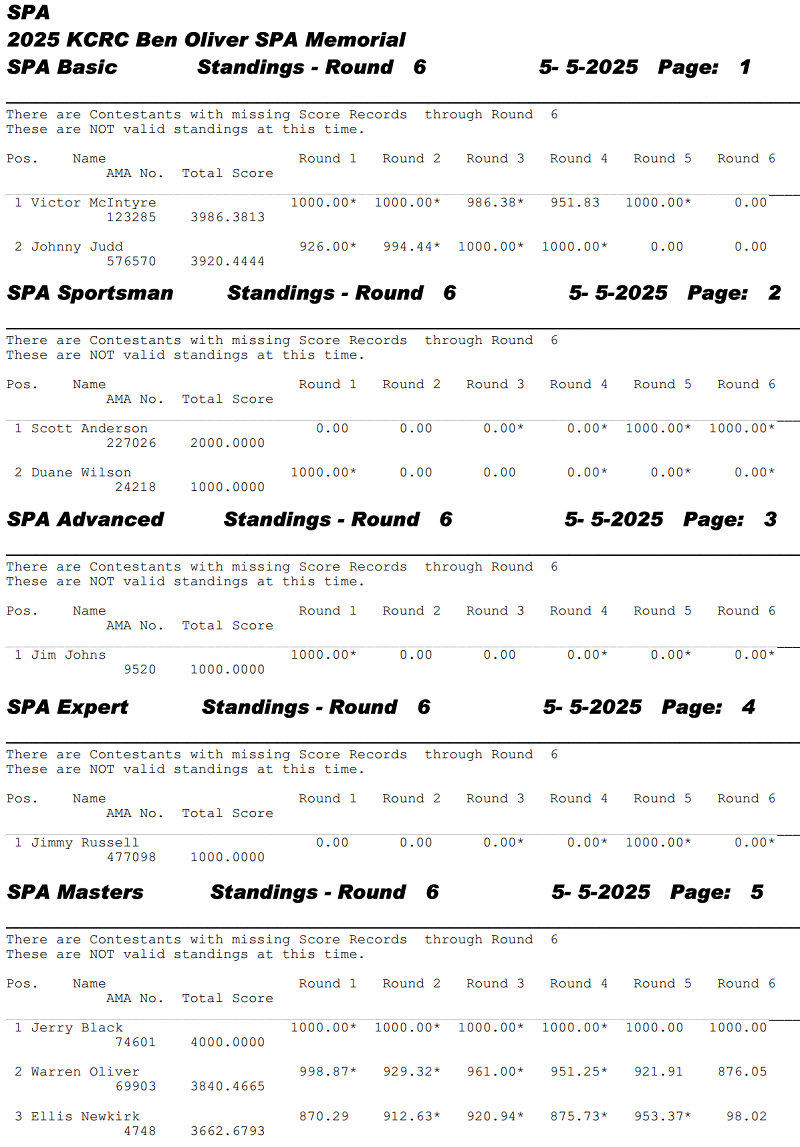 The 2025 Ben Oliver Memorial SPA Contest, sponsored by the Knox County Radio Control Club, was flown on May 3-4 near Knoxville, TN. CD Jimmy Russell did a great job of running the contest under some adverse conditions. All contestants provided judging assistance along with Scott Anderson, Jamie Strong and Vic Koenig, while Jim Johns did the scorekeeping. Bobbie & I arrived about noon Friday to find several pilots practicing. The weather was virtually perfect for early May with temperatures in the high 70s. Winds all weekend were light and generally down the runway with a bit of a crosswind. We unloaded and Jim put in his first two flights of the year with his trusty old Daddy Rabbit. He had modified it slightly over the winter so these were trim flights as well as practice. 11 pilots from 4 states showed up Saturday morning - 2 from Alabama, 1 each from Georgia & Texas, and 7 from Tennessee. Apparently some folks decided to stay home due to the weather forecast or other obligations. Unfortunately, not all who showed up were able to compete. Vic Koenig took his Phantom up for a trim flight and met one of KCRC's infamous "plane eating trees". Luckily he was able to retrieve his plane with relatively little damage but was unable to compete due to having no backup plane. He did however help with judging for the morning before heading home. Jamie Strong chose not to compete but also helped with judging. CD Jimmy Russell called the Pilots Meeting around 9 a.m. Saturday's weather was vastly different from Friday's - damp and chilly with temperatures in the low 60s but the winds were still light with the same crosswind as Friday. Rain and thunderstorms were forecast throughout Saturday, so Jimmy explained that flying would be done between showers. Jimmy elected to use only 1 flight line with only 9 contestants remaining. Two rounds were completed by 11 a.m. Saturday, followed by a combination lunch break/rain delay. Jimmy's wife Shannon and daughter Everlee brought Chick-Fil-A sandwiches, chips and drinks for lunch. Rounds 3 & 4 resumed around 2 p.m. following the mid-day rains and were completed by 4. Rounds 5 & 6 were flown before noon Sunday, and pilots packed up while the final scores were being totaled. BASIC featured Victor McIntyre and Johnny Judd in a close battle with only 8 points separating them after 4 rounds. Victor's Typhoon as grabbed by the same evil "plane eating tree" during his Round 3 landing that Vic Koenig had tangled with earlier Saturday. The damage was relatively minor and Victor was able to continue with his tiny Skylark-S foamy. Johnny decided to head home Saturday evening, allowing Victor to claim 1st Place after one additional flight on Sunday. SPORTSMAN initially had only 1 contestant - Duane Wilson. Duane flew his obligatory official flight Saturday morning. Scott Anderson had helped judge Saturday morning but had not brought a plane to fly with him. Scott returned on Sunday, brought his Deception, paid his entry fee and flew Rounds 5 & 6. Duane was offered the opportunity to fly Sunday but declined giving Scott the win. ADVANCED and EXPERT classes each had only one contestant, so Jim Johns and Jimmy Russell both flew only one official flight for their wins. MASTERS featured three veterans of SPA competition - Jerry Black, Warren Oliver and Ellis Newkirk. Jerry scored 6 Ks to take 1st place, with Warren and Ellis in hot pursuit. Awards were then handed out, followed by raffle prizes contributed by Innov8tive Designs, Balsa USA and Bob Smith Industries. Details can be found in the Photos. Packing was completed and everyone was headed home shortly thereafter. Jim Johns |