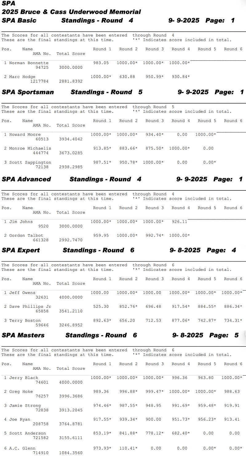The 2025 Bruce and Cass Underwood Memorial SPA Contest, sponsored by the Fountain City Flyers, was flown in Prattville, AL on September 6-7, 2025. It was a nicely run contest as is normal for the fine members of this club. We arrived around 2 p.m. Friday to find conditions hot & sweaty with a light crosswind from the west. All of the early arrivals were busy practicing or trying to beat the heat by staying in the shade. I got in 3 badly needed practice/trim flights before the heat got the best of me. The highlight of Friday evening was a wonderful chili supper furnished by Gordon Talbot and prepared by Dave Phillips. It included all the fixings - cheese, crackers, corn chips and cookies, as well as Debbie Hoke's wonderful brownies for dessert. This supper has been a feature of this contest for several years and everyone always looks forward to it. Saturday dawned warm and mostly overcast, much to the delight of the fliers because the field faces east. Registration began at 8 a.m. for 16 staunch pilots - 7 from Alabama, 3 from Georgia, 2 from Tennessee, and one each from Florida, Kentucky, Louisiana and Mississippi. These included three newcomers to SPA competition - local Marc Hodge, NSRCA President Monroe Michaelis and long time AMA pilot A.C. Glenn. Old friend Scott Sappington showed up for the first time in several years. Thank you all for joining us. We hope to see you again. Flying got under way shortly after the 9 a.m. pilots meeting. Two rounds were completed by noon, followed by a short recess for lunch of huge BBQ sandwiches, chips and drinks. Round 3 was almost complete around 3 p.m. when everything was interrupted by a heavy thunderstorm. It rained like crazy for about 20 minutes with lighter rain for a while longer. Flying resumed around 4 p.m. and Rounds 3 and 4 were completed. Sunday arrived with brilliant blue skies and BRIGHT sunshine. Things went pretty quickly, as only the Expert and Masters class fliers flew complete 5th and 6th rounds. Several folks opted not to return Sunday for various reasons. The Basic and Advanced class pilots opted not to fly at all and the only Sportsman who stayed for Sunday flew only one flight. AWARDS - CD Jamie Strong started things off by drawing for four $50 gas money prizes which went to Joe Ryan, Greg Hoke, Jeff Owens and Jim Johns. These were much appreciated by the recipients. The awarding of prizes followed with EVERY CONTESTANT receiving a plaque featuring the group photo, regardless of their placement. Each contestant also received a personal photo with his plane. BASIC - long timer Norman Bonnette handily won the class. Marc Hodge unfortunately lost his beautiful Killer Chaos during a Saturday morning practice flight, but did a very respectable job flying his 4 Star 54 to take 2nd Place, including winning the first round. SPORTSMAN - Howard Moore won three rounds to secure the victory in Sportsman, followed by Monroe Michaelis and Scott Sappington. Scott and Monroe did not stay to fly on Sunday. ADVANCED - This class was a real dog fight. Jim Johns won the first 3 rounds and Gordon Talbot took Round 4. Both pilots agreed not to fly on Sunday, preferring not to risk their planes in the incredibly bright sunshine. This gave the win to Jim with Gordon a mere 7.25 points behind. EXPERT - SPA President Jeff Owens handily took the top prize in Expert class by winning all six rounds, followed by Dave Phillips and Terry Boston. MASTERS - Masters class featured 6 pilots, the most in any class. Jerry Black and Greg Hoke battled for top honors in Masters. Jerry prevailed over Greg by only 3.6 points. They were closely followed by CD Jamie Strong in 3rd Place. Joe Ryan, Scott Anderson and A. C. Glenn rounded out the field. Several honored guests showed up over the weekend. Long time friends Larry Hill and Tom Stennis came out to visit with us during the day Saturday, along with Ken and Dee VandenBosch. I'd like to offer a very personal Thank You to Ken for his assistance in getting me to and from the flight line in my wheelchair on Saturday. You are a true friend, sir. Everyone was invited to attend the SPA Masters contest in Memphis, TN on October 4-5. Goodbyes were said to complete a great weekend and most everyone was on the road home by 1 p.m. Jim Johns |
